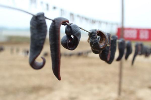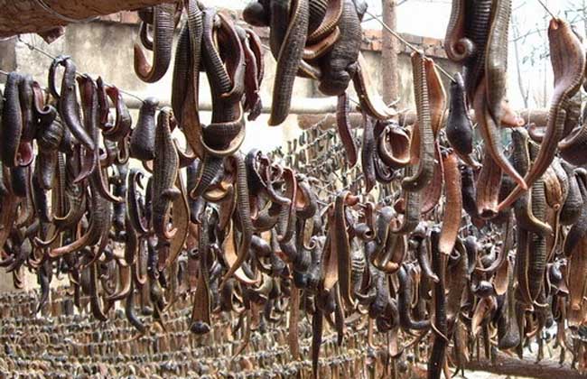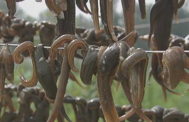 水蛭采收一般在 10 月中下旬,水蛭长到 15~20 克左右,开始池水进行排干捕获。自然吊干待商品出售。成品以大小 整齐、表面乌黑呈胶质状、有光泽为佳。