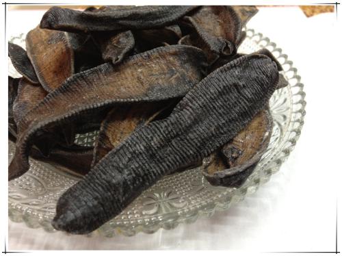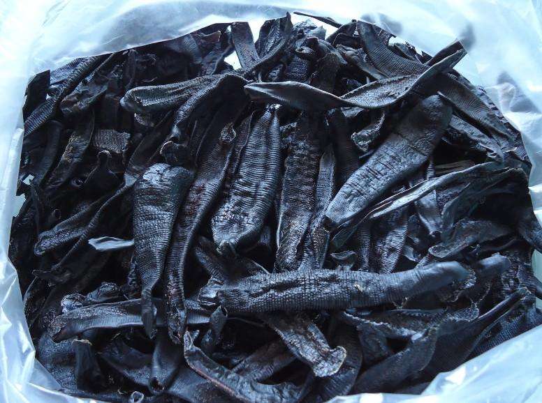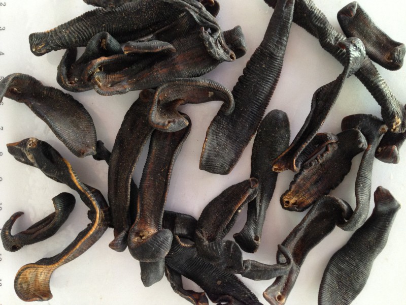 ④提取后的药渣:将已提炼出有效成分但外形完整的水蛭再晒干后出售,这种水蛭已没有药效,其断面参差不齐如糟糠,体质轻泡,需要仔细辨别。