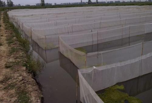 水蛭苗放养时间一般为五月中旬,晴天上午,温度适宜。网箱里面种植水葫芦。