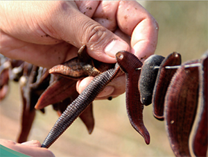 6、及时捕获:捕获期一般在10月份。打捞出来的水蛭按大、中、小分开。大的筛选出来放回池中留做水蛭种;小的另外放在一个池中继续词养,以便第二年养到15克以上时打捞出售;中等的应马上加工成干品后出售。