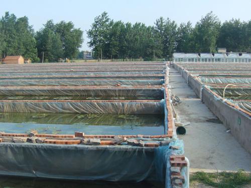 水泥池一般用砖、水泥、河沙等材料建成。也可在地面上建池,四周用塑料膜隔离,建池一个原则不漏水就行。水泥池一般东西走向,大小要因地制宜,长度不限,一般宽3米左右,池底中间约低,两边约高,出水边低,进水口边高,这样便于清池放水,两边有平台,池深一般80厘米。池对角设进水口和出水口,进水口和出水口套上80目的呢龙网子防水蛭爬出。池底做一个排水排污的出水口,池身离池底60厘米处做一个防洪排水口。池边用砖盖出5至10厘米,池与池间留80厘米宽的管理人行道。一个水泥池一般一不超过100平方为好。