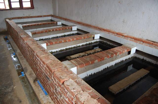 1、种蛭池的建造外围建造和一般水泥池一样,只是面积大些,水泥池宽5米,长不限,把池分成2:1:2的宽,在池内再做一个低于外围池身40公分的平台,平台上放上经过消毒杀菌杀虫后的腐殖土30公分左右。供种蛭休息产卵。池中间的1米灌上与里水泥平台深度一致的水供水蛭取食,