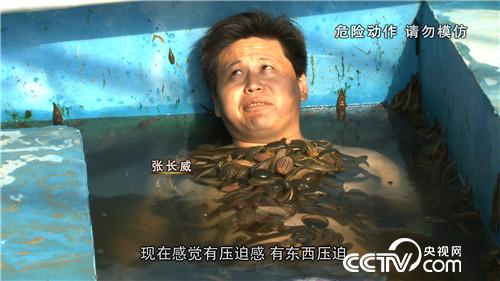 张长威躺在水蛭中间,还不停地让工作人员往他身上倒水蛭,这些水蛭有的吸血有的吃肉,万一伤到张长威怎么办?周围的人都替他捏了一把汗。