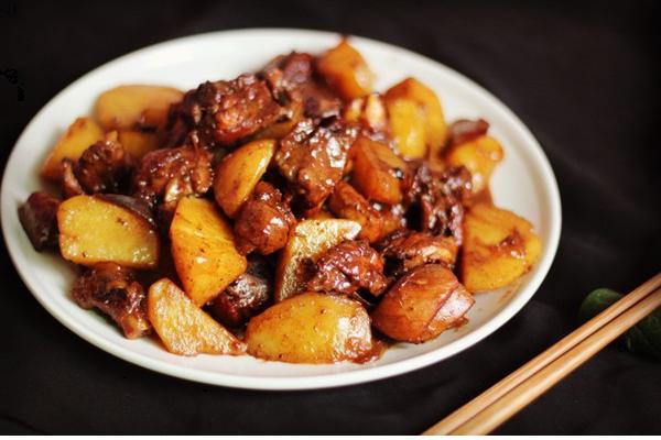 4、锅内再加适量油烧热,大火爆香姜片、豆豉、蒜头,将腌好的鸡入锅赞少许酒,淋入调味料(蚝油1汤匙,生抽1汤匙,糖1/2茶匙,上汤5汤匙,生粉1茶匙)兜匀,盖上锅盖煮至差不多收水时加入青椒,待熟后将土豆片回锅兜匀,最后淋几滴麻油装碟上桌即可。