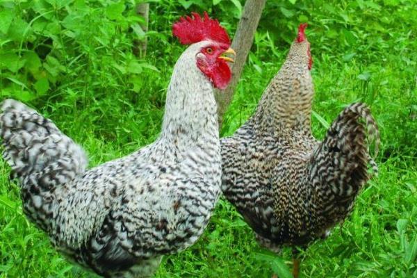 外貌:横斑洛克鸡体型偏圆,身躯各部发育良好,全身羽毛黑白相间的横斑纹,羽毛末端为黑色,斑纹清晰一致,公鸡的自色横斑约2/3,黑色约占1/3,母鸡的黑白横斑几乎相等,母鸡的羽毛较浓,而公鸡较淡,单冠,耳叶红色,嵘、胫、趾及皮肤均为黄色;浅黄洛克鸡外貌特点与横斑洛克鸡相似,只是全身羽毛呈现浅黄色;白洛克鸡为单冠,肉垂和耳叶均为红色,味、胫和趾均为深色,皮肤为浅黄色,全身羽毛为白色。