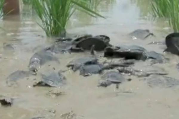 4、水位管理:甲鱼放养初期保持水位80-100厘米,随着水温的升高和个体的增长逐步加高水位。春秋季每半月加注1次新水,夏季每周加注1次新水,夏季和初秋高温季节要提高水位。