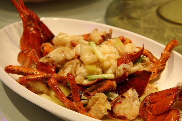 材料:澳洲龙虾、芝士、白葡萄酒、葱、火腿粒、洋葱、姜、蒜