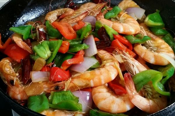 材料:基围虾、青尖辣椒、红尖辣椒、香菜、料酒、洋葱、花椒、辣酱、胡椒粉、鸡粉、生抽、蚝油、生姜、大蒜,葱、白糖、辣椒油