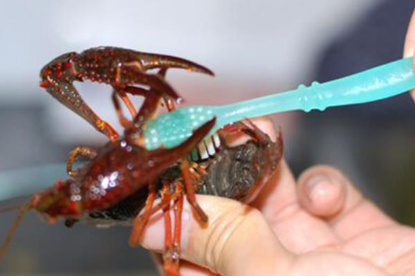 然后用家里不用的牙刷或者钢丝球洗刷腹部刷去泥土,一只手要抓住龙虾的背部,防止手被钳住。