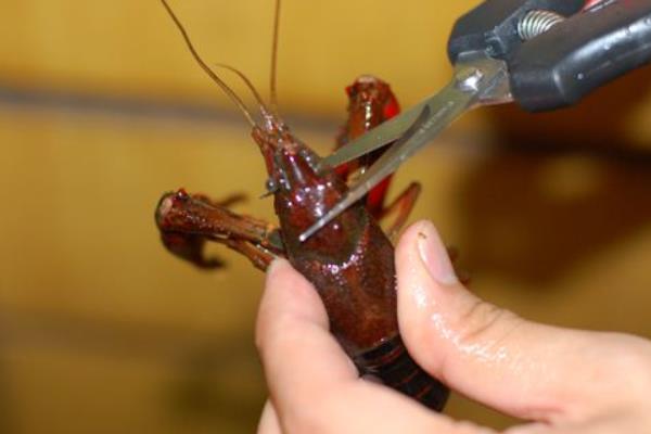 虾的头部有个内脏,聚集很多没消耗掉的脏东西,这个是需要去除的。在龙虾头部三分之一的地方用剪刀稍微剪开一个口子,不要直接剪断,然后就会看到一个黄色和黑色的,黑色是内脏,然后把内脏扯掉就可以了。