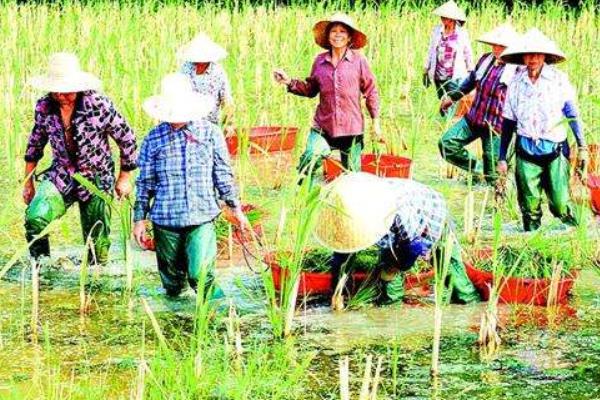 五、选好茭白种苗在9月中旬至10月初,于秋茭采收时进行选种,选择植株健壮,高度中等,茎杆扁平,纯度高的优质茭株作为留种株。 六、适时移栽茭白在3月下旬至4月中旬将茭墩挖起,用利刃顺分蘖处劈开成数小墩,每墩带匍匐茎和健壮分蘖芽4个―6个,剪去叶片,保留叶鞘长16厘米―26厘米,减少蒸发,以利提早成活,随挖、随分、随栽。株行距按栽植时期,分墩苗数和采收次数而定,双季茭采用大小行种植,大行距1米,小行距80厘米,穴距50厘米―65厘米,每亩1000穴―1200穴,每穴栽6苗―7苗,栽植方式以45度斜插为好,深度以根茎和分蘖基部入土,而分蘖苗芽稍露水面为度。 七、放养淡水小龙虾在茭白苗移栽前10天,对虾坑进行消毒处理。新建的虾坑,一定要先用清水浸泡7天―10天后,再换新鲜的水继续浸泡7天后才能放虾,每亩可放养2厘米―3厘米的小龙虾幼虾0.5万―1万尾,应将幼虾投放在浅水及水葫芦浮植区;在虾种投放时,用3%―5%食盐水浸浴虾种5分钟,以防虾病的发生。同时每亩投放螺蛳20公斤―30公斤,每亩投料1.0公斤―2.5公斤。