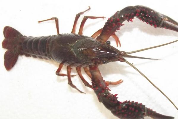 2、形态特征。小龙虾整个身体由头胸部和腹部共20节组成,除尾节无附肢外共有附肢19对,体表具有坚硬的甲壳。性成熟个体呈暗红色或深红色,未成熟个体淡褐色、黄褐色、红褐色不等,有时还见蓝色。常见个体长4~16厘米。
