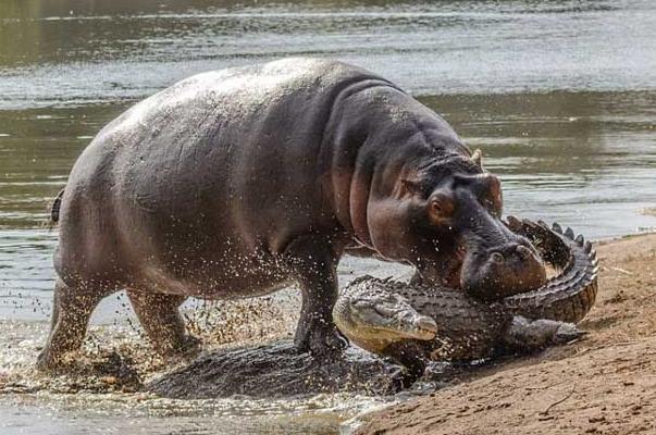 河马的体积庞大,它们是淡水生物中体型最大的杂食性哺乳动物,拥有一张巨大无比的嘴,而且牙齿也很大,若是鳄鱼不慎将它们惹怒,它们呈獠牙状的门齿和犬齿就会成为最有力的进攻武器,鳄鱼的处境也会很危险。