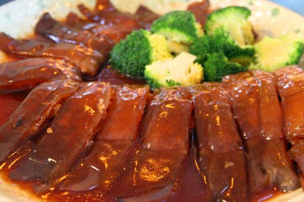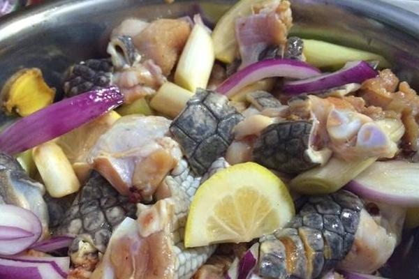 材料:鳄鱼腩(鳄鱼腹腔处的肉,其口味鲜香,肉质爽,色洁白,一般冰鲜鳄鱼腩在国内市场的售价约为42元/斤)300克,红枣20克,干金针30克,云耳10克,荷叶1张。调料鸡粉、盐各5克,糖3克,胡椒粉、蚝油各8克,料酒、姜片、蒜蓉各10克,葱段20克。