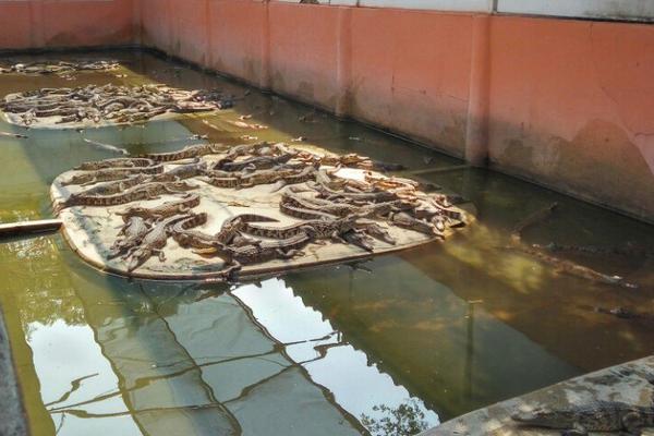 鳄鱼场位于独联村的田间,由几间普通棚舍组成,乍看似乎与普通养猪场无异,其实这就是会城人李朝臻建立起的鳄鱼王国。经李朝臻同意及指导,记者小心翼翼地走入其中一个鳄鱼棚舍,发现棚舍下面是一个个水池,小鳄鱼们懒洋洋地将半边身体没入水中,不愿动弹,其所在的水池内浮满了大量绿色浮游物。据李朝臻解释,鳄鱼的免疫系统十分强大,不但能适应在这样的环境生长,其体质还不会受到污染。记者还注意到,除集中养小鳄鱼的棚舍外,鳄鱼场内还有专门放养体型较大的鳄鱼的棚舍,原来鳄鱼是食同类肉的动物,大了之后就必须将其分开养。跟此前参观的棚舍不同的是,该棚舍几乎完全密封,既不通风,也不透光,一走进去就能感觉到里面空气闷热。