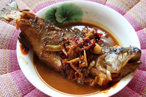 制作步骤:先将鱼清洗干净,冷锅烧热,放入适量的油和大料炒香后将鱼放入,然后放入葱其他佐料,再放入适量的清水,熬半小时收汁后即可出锅。