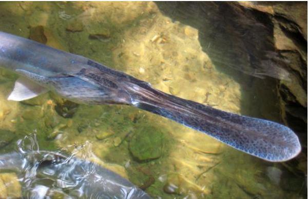 鸭嘴鱼(匙吻鲟)为硬骨鱼类,体表裸露,泽润无鳞,吻呈汤匙状,形似鸭嘴,故又名鸭嘴鲟。它的吻特别长,呈扁平,如浆状;体表光滑无鳞,背部黑蓝灰色,常有一些斑点间在其中;体侧有点状赭色,腹部白色;口大眼小,前额高于口部;鳃耙密而细长,鳃盖骨大而向后延至腹鳍,尾鳍分叉,尾柄披有梗节状的甲鳞。 匙吻鲟的个体较大,寿命在30年以上。匙吻鲟的性腺成熟较晚,一般要在8龄以上才性成熟。 匙吻鲟的食性类似我国的鳙鱼,是以摄食浮游动物为饵料的,是滤食性鱼类。