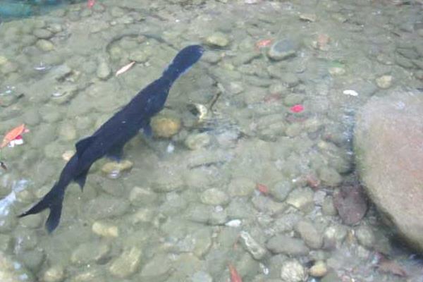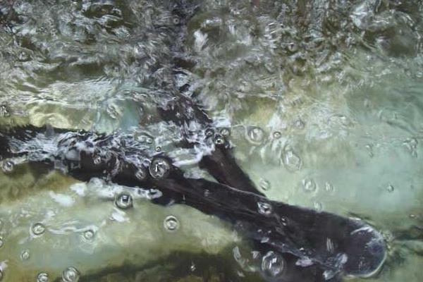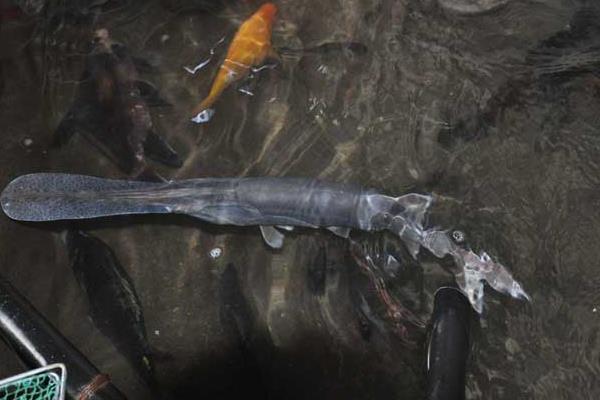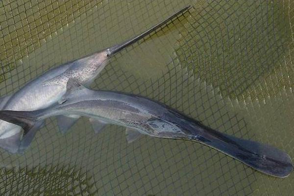 ② 混养。体长25厘米时每亩50~70尾,年底长至1公斤;体长50~60厘米时每亩20~50尾,年底长至2~3公斤。第三年每亩7~8尾。成鱼池塘养殖不宜在小面积或精养高产塘中混养,因为精养塘高产量、高密度,溶氧大起大落,轮捕轮放都对匙吻鲟十分不利。