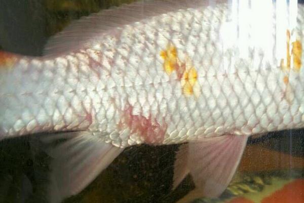 1、典型的赤皮病,症状:表皮大面积充血。鱼体表面没有大面积溃疡、浓肿,只有鳍基、鼻孔等明显发红,显出血丝。后期伴有腹水和烂鳃。病源及感染原因:由荧光极毛杆菌引起,易传染。水质不洁、外伤、饵料变质等都会引起此病,一年四季都会发生。治疗:在原缸(池)内用2ppm的呋喃西林溶液浸泡病鱼,连续浸泡数天,直至病情好转。