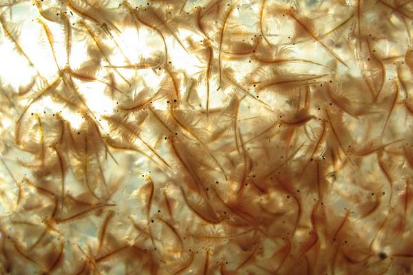 2、最安全的活饵应该就算是丰年虾(无节幼虫)吧,准备时间并不需要太长,也不需要太多的手续,不过孵化出来以後,应该尽快喂食,因为无节幼虫最营养的就是刚孵化出来还带着卵黄囊的时候,如果时间拖的太久,卵黄都已经被无节幼虫吸收殆尽,因此营养价值就会稍微打点折扣。如果网友有孵化丰年虾来喂食孔雀的习惯,如果有多孵的丰年虾,可以将他冷冻起来,下次要在喂食的时候,只要解冻就可以用。