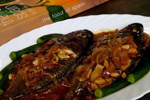 3、放入煎好的罗非鱼,用小火烧至入味后捞出装盘,剩余汤汁煮至稠浓,淋上香油后浇在鱼身上即可。