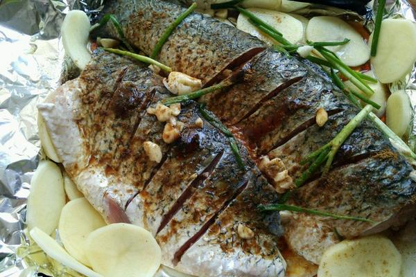 材料:罗非鱼1条、红葱头适量、大葱适量、蒜头适量、孜然粉适量、盐适量、姜适量、黑椒粉适量、烧烤汁适量、油适量