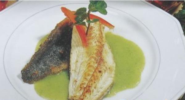 2、取煎盘,烧热后加油,用中火将鱼肉煎熟。另取锅放入少量油,先将洋葱末煸香,再倒入白酒、鱼汤和盐,用大火收浓至一半时,投入新鲜他拉根,略煮后即用粉碎机粉碎成汁水。装盆时先将他拉根汁淋在盆内,上面轻轻放入鱼肉,加以装饰。