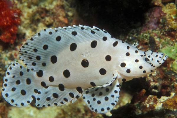 特征:最大体型71cm。体呈淡色至绿褐色,头部、体侧及各鳍上具许多隔开的大小不一的圆形黑斑;体侧的一些斑点和奇鳍基部被一个较大的暗斑覆盖。幼鱼上的黑色斑点比成鱼少,其大小与眼睛相同甚至更大。
