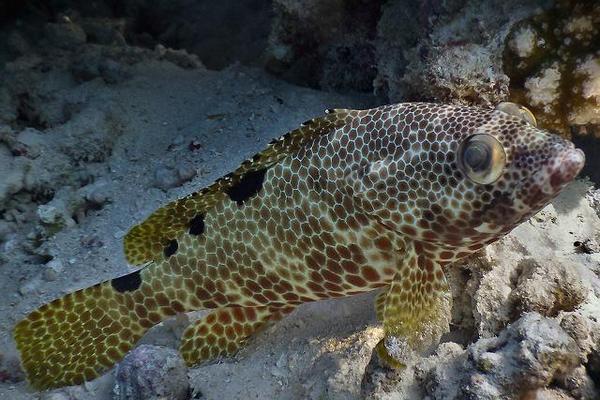 特征:蜂巢石斑鱼大约五条比较深色的斜条纹,每个二到五个六角形宽的,在侧边上重叠了而且从眼放射;在侧边上的六角形可能合并成短的列。