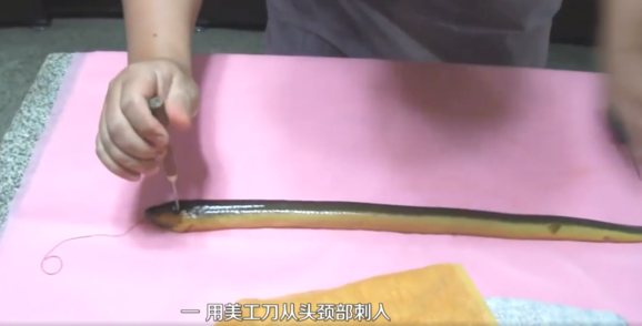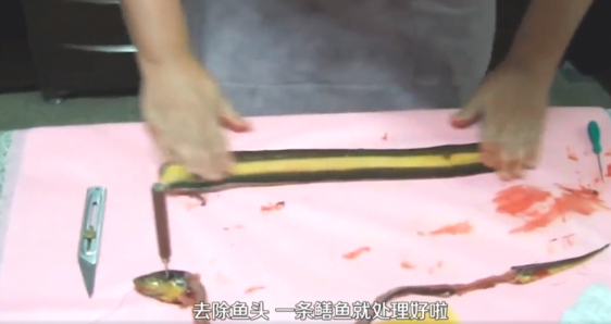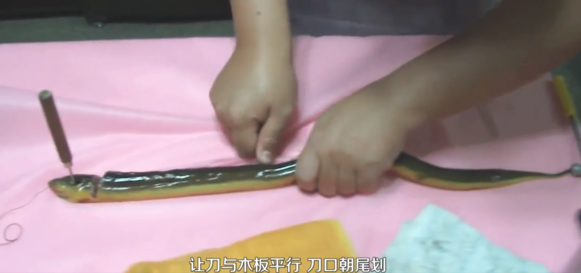 4.用美工刀从头颈部挑起鳝鱼的脊椎骨,从头至尾剔出。