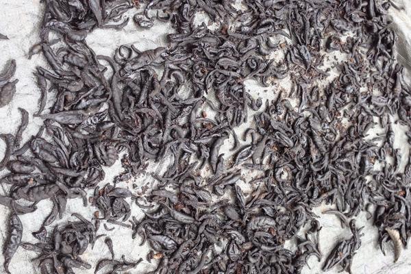 盐墨水蛭:用盐淹渍的水蛭,表面泛有白色的结晶盐,因此不法商贩将其放入墨汁中浸过后晒干。这种伪品只要用拇指和食指搓擦即可见墨色染手。