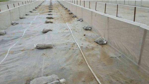4、水蛭卵茧入箱的第二天,将裁剪为20.5米2.05米规格的网目为5厘米的聚乙稀网片,覆盖在4排五个纵向排列的网箱上防鸟害,并用网针把防鸟网按1米1结的标准缝合固定在网箱上。