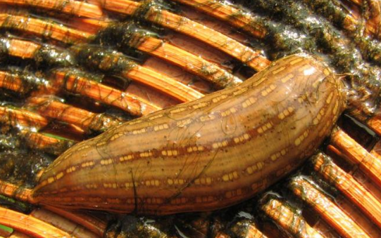 宽体金线蛭体长大,略呈纺锤形,扁平,长6~13厘米,宽0.8~2厘米。背面通常暗绿色,具6条细密的黄黑色斑点组成的纵线,背中线1条较深。腹面淡黄色,杂有许多不规则的茶绿色斑点。体环数107。环带明显,占15环。雄生..