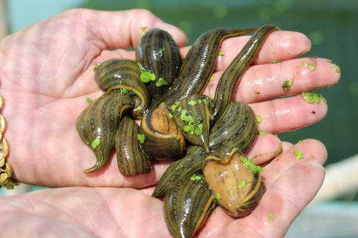 1、日本医蛭:日本医蛭又名医用蛭,体狭长稍扁,略呈圆柱形,体长3~5厘米,宽4~5毫米(固定)。背面绿中带黑,有黄色纵线5条。腹面子坦,灰绿色,无杂色斑纹。体环数103。环带不显著,占15环。雄生殖孔在31~32环沟间。雌孔在36~37环沟间。眼5对,列成弧形。体前端腹面有一前吸盘。食道纵褶6条,颚3片,半圆形,颚齿发达。后端腹面有一后吸盘,碗状,朝向腹面,肛门在其背侧。生活于水田及沼泽中。吸人、畜血液。行动敏捷,能作波浪式游泳和尺蠖式移行。春暖时即活跃,6~10月为产卵期,冬季蛰伏。再生力很强,如将其切断饲养,能由断部再生成新体。全国各地均有分布。