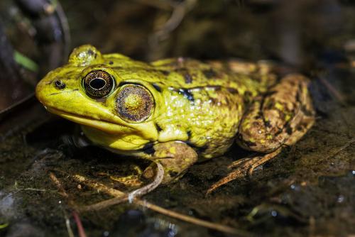 沼泽绿牛蛙的体形与一般青蛙相似,个体比本地青蛙大,但比牛蛙小,最大个体500克左右,蛙体扁平,头小巨扁,鼓膜不很发达,眼小突出,前肢较小,后肢粗大发达,不善于跳跃。360养殖网带大家欣赏沼泽绿牛蛙图片大全。<