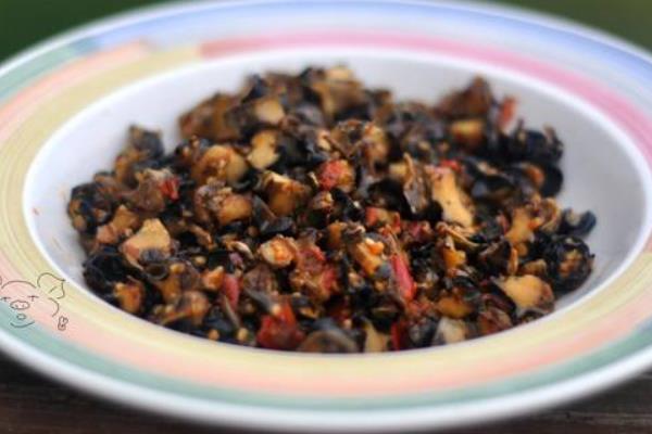 2、再放辣椒油、紫苏叶、盐、料酒继续爆炒5分钟即可上碟。这里是以酸笋来炒螺。将螺与酸笋一起炒了,再放入自制的辣椒油,最惹味。