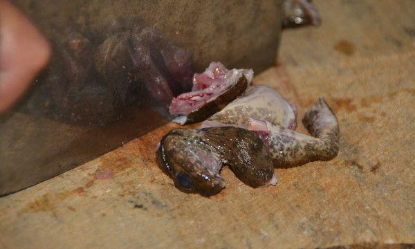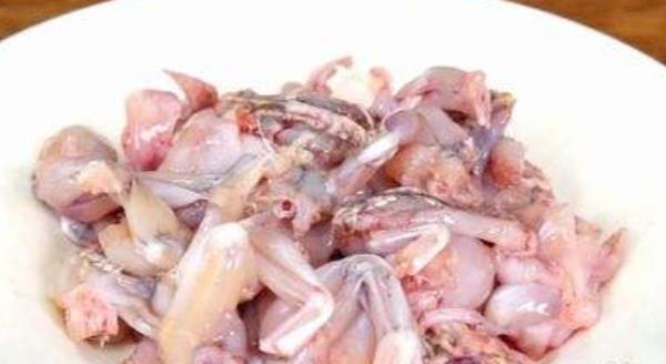 1、在石蛙的尾部轻划一刀,然后剥皮,去内脏,清洗干净。