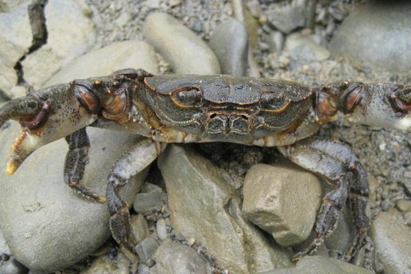 这是中华绒蟹的一种,它体小,仅有一颗大衣纽扣大小。揭开蟹盖,蟹黄呈猪肝紫色,煮熟后变成橘红色,味极鲜美。紫蟹都产在寒风凛冽的冬季,因此,常常用于什锦火锅。