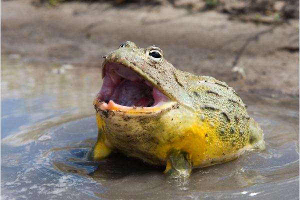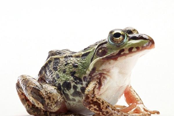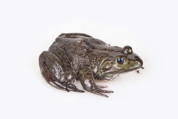 2、牛蛙:牛蛙头部宽扁,口端位,吻端尖圆面钝,眼球外突,背部略粗糙,有细微的肤棱,四肢粗壮,前肢短,无蹼,后肢较长大,趾间有蹼,肤色随着生活环境而多变,通常背部及四肢为绿褐色,背部带有暗褐色斑纹,头部及口缘鲜绿色,腹面白色,咽喉下面的颜色随雌雄而异,雌性多为白色、灰色或暗灰色,雄性为金黄色,鸣声很大。