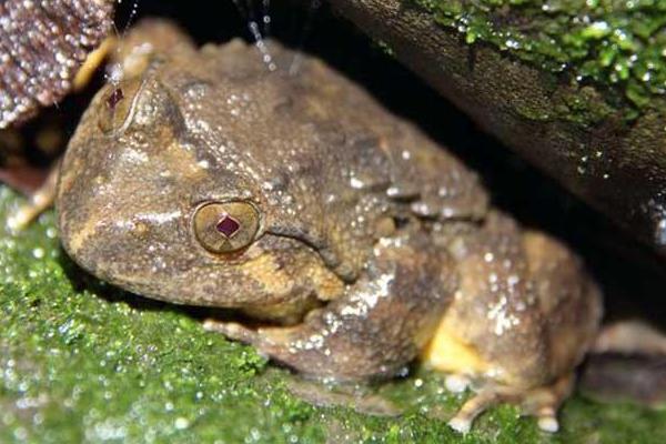 2、四肢:雄蛙前肢特别,背部有长短不一的窄长疣,断续成行排列,间有小圆疣,性成熟后整个胸部有黑刺状棘突,基部肉质疣壮隆起,但不分成两团,二指内侧也有刺突,有单咽下内声囊,腹呈淡黄白色,雌性前肢不如雄性发达,背面无窄长疣,均为分散圆疣、胸部无刺状棘突,腹面光滑呈白色。