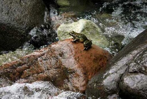 石蛙常喜栖息于深山老林的山涧和溪沟的源流处,尤喜栖居在悬岩底的清水潭以及有瀑水倾泻而下的小水潭,或有水流动、清晰见底的山间溪流中。
