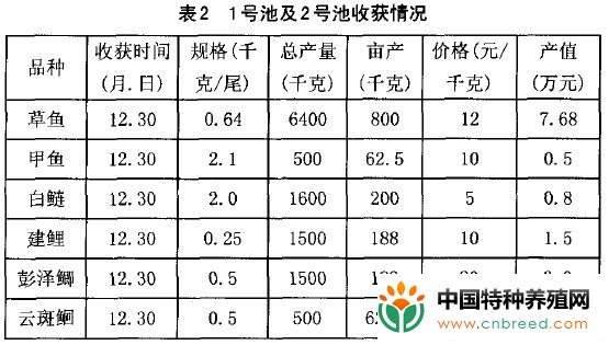 2号池从2月l6日放养至7月20日全部达到商品规格收获。此时市场鱼价最高时, 共出池商品鱼7400千克,产值9.18万元,详细情况见表1。