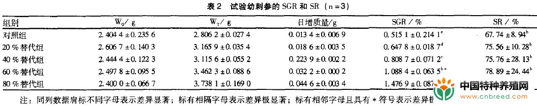 1、添加黄粉虫粉对刺参生长和成活的影响从表2可见:经过30天的饲养试验,黄粉虫粉各试验组刺参的SGR均显著高于对照组,20%组、40%组、60%组和80%组的幼参SGR分别比对照组高25.76%、56.99%、111.30%和186.72%;随着黄粉虫粉替代量的递增,刺参的SGR和SR都逐渐升高,且黄粉虫粉替代鱼粉各组间的SGR差异显著;各试验组幼参的SR 变化在67.74%-95.56%,20%黄粉虫替代组、40%黄粉虫替代组、60%黄粉虫替代组及对照组的SR彼此差异均不显著,而80%黄粉虫替代组的刺参sR显著高于前4组。