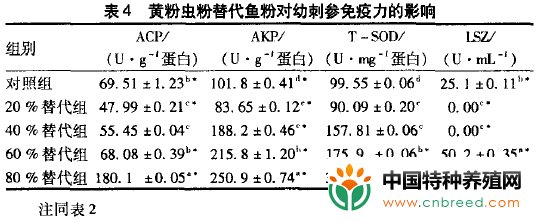 从表4可见:刺参4种免疫酶的活性也与黄粉虫粉替代鱼粉量呈正相关关系。与对照组相比,20%组4种免疫酶活性均显著低于对照组,而其他黄粉虫替代鱼粉组的AKP和T—SOD活性及80%组的ACP活性均极显著地高于对照组;60%组与80%组的LSZ活性显著高于对照组、20%组和40%组。值得注意的是,黄粉虫替代鱼粉各组的ACP、AKP和T-SOD活性彼此间均差异显著,而80%组与其他3组的差异极为显著。