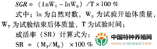 试验期间,每10天测定各试验组刺参体质量,同时记录生活状态和存活个体数,在试验的前1天与最后1天各停食1天后将每个水槽中刺参全部称质量,称量时将刺参过滤到筛绢网中并在于滤纸上停留30S,测其质量,分析天平感量为0.01g。计算特殊生长率(SGR):