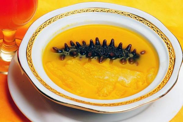 做法:用高汤烧入味,南瓜蒸熟后粉碎成细茸,加高汤调制成卤汁,装入盘中。将烧好的海参放入卤汁上,放上菜心即可。