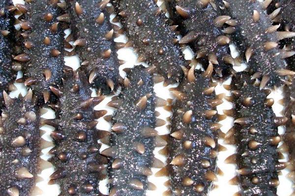 2、沙嘴:刺参的沙嘴大而坚硬。肉质上,野生海参因为生长水域深(15到20米),水温低,日照少,生长慢,肉质厚实有弹性,筋宽厚饱满,沉积的营养物质丰富;而圈养的海参生长的快,肉质松软不紧实。