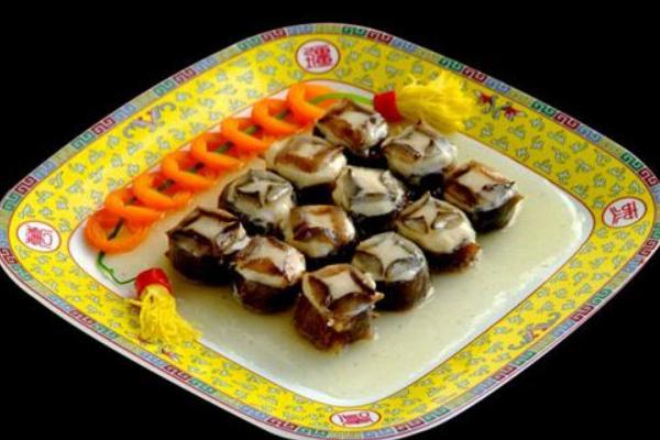 4、另在锅内烧开清汤,力口盐、味精、料酒、胡椒粉等调料,勾二流芡,取出笼内海参扣入大盘中,将勾好芡的滋汁淋于盘中,再淋上些许鸡油即成。