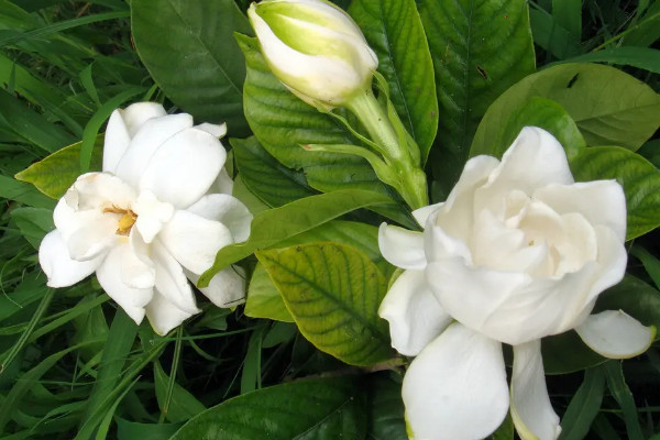 大叶栀子花是多年生常绿灌木植物,嫩叶为嫩绿色,老叶深绿色,叶片表面光滑,呈长椭圆形,枝干颜色灰色,花朵白色,直径可以达到10厘米,开放时会散发香味。