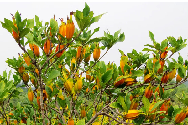 黄栀子花的叶片对生,叶形多样,大多为长圆状披针形、倒卵状长圆形,长度为3-25厘米,宽1.5-8厘米,植株主要生长在海拔10-1500米的旷野、丘陵、山谷、溪边等地。